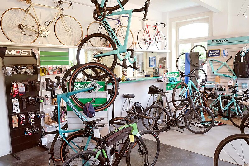 In seinem Einmannbetrieb stehen 100 m² als Verkaufsfläche und 15 m² Fläche für die Werkstatt zur Verfügung. Ausser Pinarello verkauft Salvadori auch Renner von Colnago und Bianchi – und Gravelbikes von Scott.