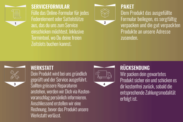 Alle Fachhändler werden gebeten vorab einen B2B Zugang zu erstellen. Sobald dieser Zugang freigeschaltet worden ist, hat man Zugriff auf den Suspension-Service oder Webshop mit hinterlegten Händlerkonditionen. Nach erfolgter Servicebuchung wird automatisch eine E-Mail zur Bestätigung der Buchung zugesandt, worin die Anlieferadresse hinterlegt ist. Das Produkt sorgfältig verpacken und das Formular beilegen. Sobald das Produkt angeliefert wurde und der gebuchte Termin fällig ist, wird der Service ausgeführt oder folgte eine Information über mögliche Verzögerungen aufgrund grösserer Reparaturen oder Schäden am Fahrwerk. Wenn alle Arbeiten abgeschlossen sind, wird das Produkt sorgfältig verpackt und per A-Post zurückgesandt.